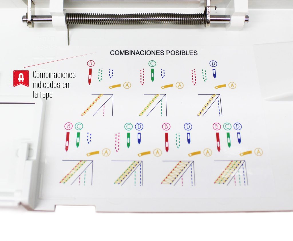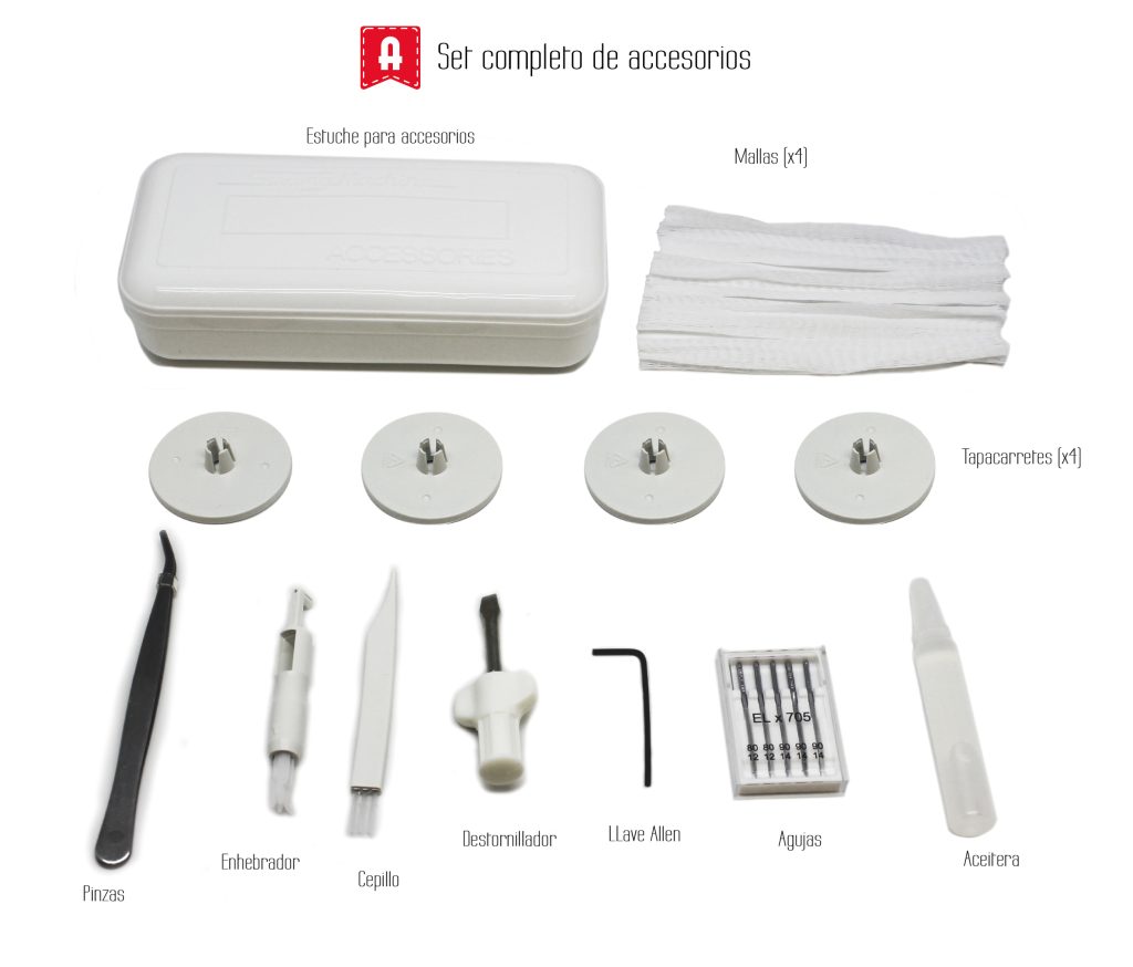 Accesorios incluidos: Destornillador, brocha de limpieza, llave hexagonal, pinzas, mallas x 4, kit de agujas, enhebrador de aguja, tapa porta hilo carrete x 4, aceite de máquina, caja de accesorios