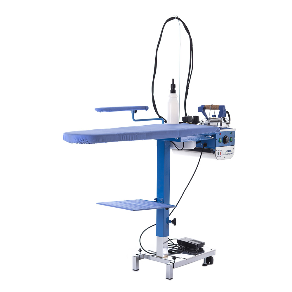 Mesa de planchar con caldera de 2,2 litros y regulación de altura de 85 hasta 110cm. Sistema de regulación por muelle con simplemente presionar el plato. Equipada con aspiración, plato caliente, resistencia externa, indicador luminoso fin agua, plancha de mano, antena, apoya plancha de silicona y brazo incluido. Medidas del plato 110X22X38cm.